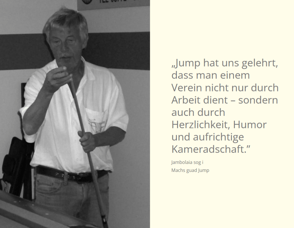 Doch was uns an „Jump” vielleicht am meisten in Erinnerung bleiben wird, ist der Mensch hinter dem Amt: ein fröhlicher, positiver Zeitgenosse, der mit seinem Humor und seiner herzlichen Art jeden Raum aufhellen konnte. Im Umgang mit seinen Vereinskameraden war er stets respektvoll und wohlwollend – ein Vorbild, wie man miteinander umgeht.
